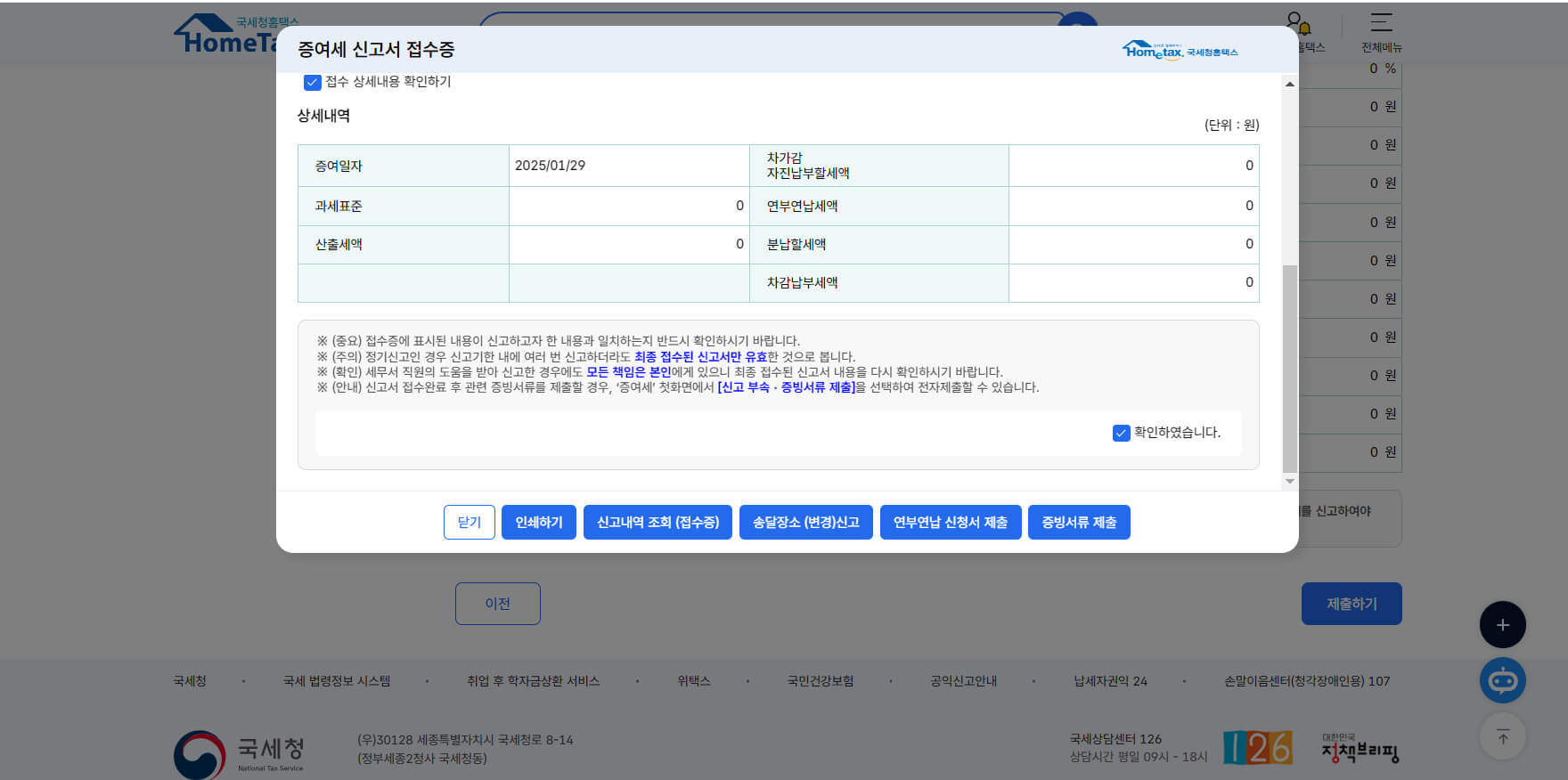 제출하기를 누르면 증여세 신고서 접수증이 뜨고 그 화면에서 증빙서류 제출 버튼을 눌러 미리 다운로드 했던 가족관계증명서와 이체확인증을 PDF 파일로 첨부합니다.