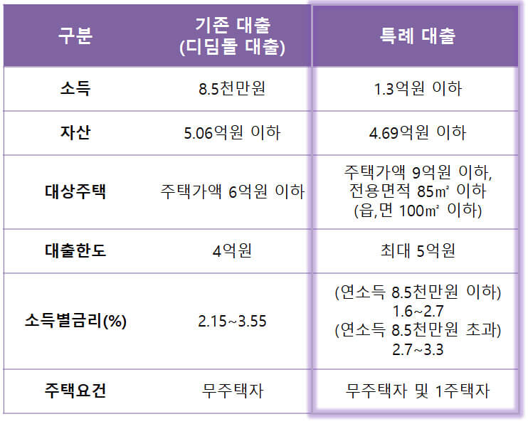 주택 구입자금 대출 해당 조건은 1) 무주택 세대주(신규대출) 및 1주택자(대환대출) 2) 부부합산 연소득 1.3억원 이하 3) 순자산 4.69억원 이하 4) 대상 주택가액 9억원 이하, 전용면적 85 ㎡ 이하 (읍ㆍ면 100㎡) 5) 대출신청일 기준 2년 이내에 출산한 가구 이며,
